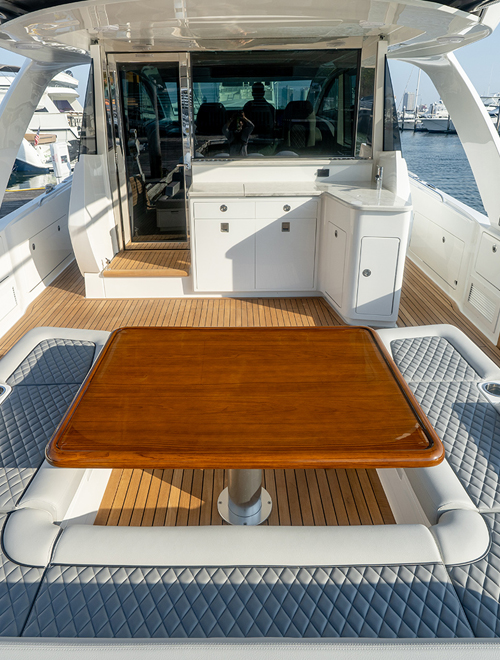 Boarding platforms outboard of the engines lead to a pair of glass doors that provide cockpit access. Designed for maximum relaxation and outdoor entertaining, the yacht is offered with several different aft deck layouts.