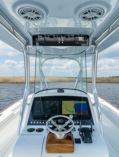 Like the larger Valhalla models, the optional V-29 hardtop comes with a six-rod rocket launcher, molded-in electronics pod and ample lighting (such as bow and cockpit facing Lumitec spreader lights and overhead lights) and molded-in speakers. Light bars, FLIR infrared camera and radar will also be available for those looking to enhance fishing capabilities and safety. Telescoping or fixed outrigger poles from Gemlux are also available. A second station stand-on console option is available for those looking for a bird’s-eye view.