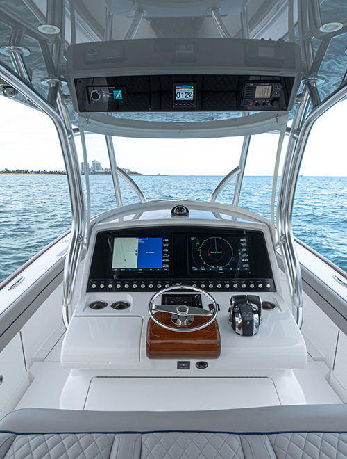 Like the larger Valhalla models, the optional V-33 hardtop comes with a six-rod rocket launcher, molded-in electronics pod and ample lighting (such as bow and cockpit facing Lumitec spreader lights and overhead lights) and molded-in speakers. Light bars, FLIR infrared camera and radar will also be available for those looking to enhance fishing capabilities and safety. Telescoping or fixed outrigger poles from Gemlux are also available. A second station stand-on console option is available for those looking for a bird’s-eye view.