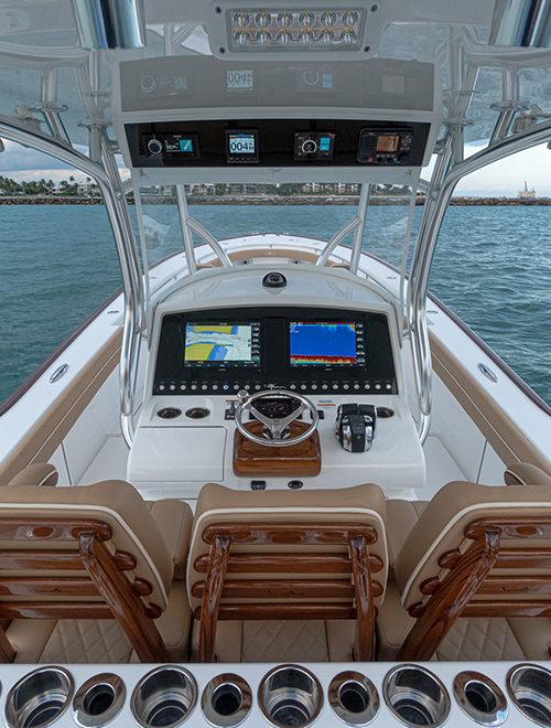 The fiberglass hardtop can be equipped with an array of accessories that heighten fishing capabilities, such as a six-rod rocket launcher, molded-in electronics and radar pods and Lumitec spreader lights. You can also get a custom fabricated fold-down marlin tower and fixed or telescoping outriggers from Gemlux or Rupp. A variety of Costa Marine covers will help you protect your investment. Covers for the entire boat, all of the engines and individual areas such as the console, helm seating and lounge are available.