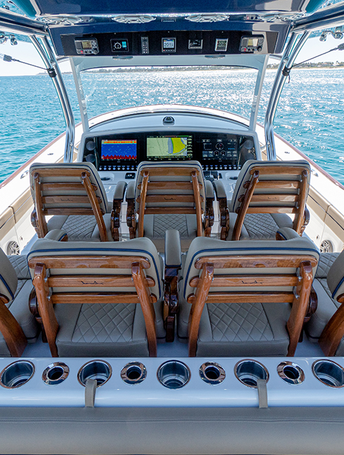 The console, helm seating modules and the forward lounge are all elevated on a 7-inch-high platform, which maximizes visibility and allows for increased interior volume below. The console maintains the streamlined, clean design of the V Series, with its controls and information displays positioned for ease of access and viewing. An expansive recessed black acrylic helm panel can hold three electronics displays up to 22 inches each. A row of flush-mounted Bocatech switches (with backlit labeling) lines the lower dash. The engine controls and Zipwake interceptor trim control panel are positioned to starboard of the centerline helm pod (available in teak or faux teak) and Edson stainless steel wheel with power knob. Quick downward glances allow for regular performance checks via the high-definition engine monitor. Convenient stainless steel cupholders are nested neatly in the console.