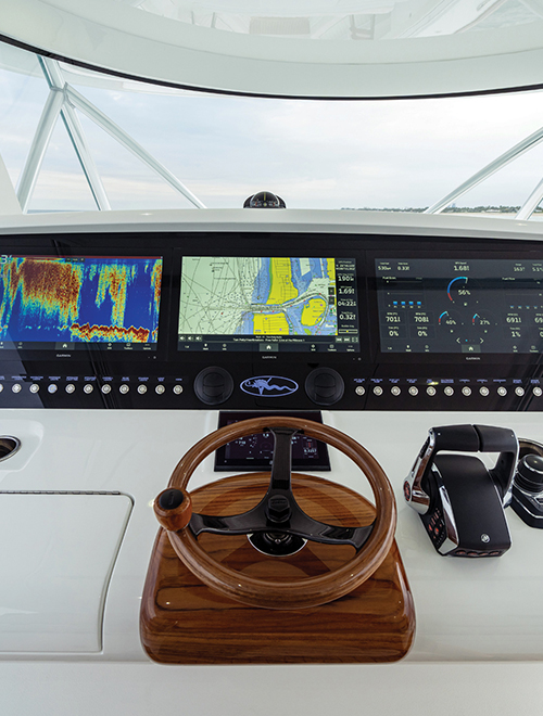 The V-55 benefits from Viking’s vertical integration, including the ability to outfit her with a custom Palm Beach Towers (a Viking company) gap tower. The hardtop package comes with a slew of fishing and navigational features and equipment, including an integrated electric teaser reel box; a six-rod rocket launcher; and molded-in pods for spreader lights, overhead electronics and radar antenna. VBW offers factory-installed electronics packages from Garmin or Simrad; custom installations of navigation, communication and entertainment systems from the Viking subsidiary Atlantic Marine Electronics – another example of vertical integration at work – are also available to owners.