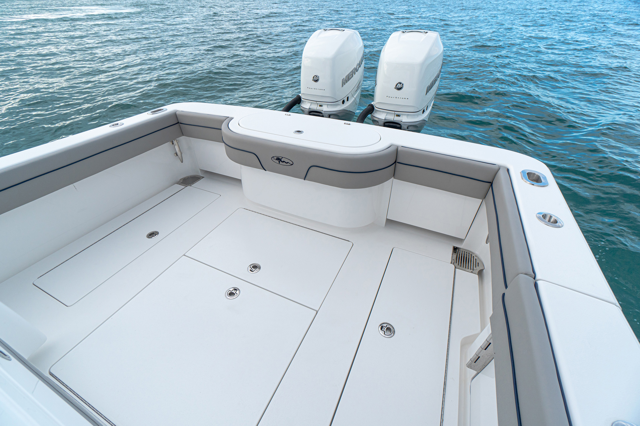The V-33 was designed for maximum live well and fish box capacity. A standard 52-gallon transom live well anchors the cockpit, and five overboard-draining in-deck fish boxes from 32 to 98 gallons are strategically positioned so you’re never more than a half-step from a home for your catch. Choose from an array of fishing equipment and accessories to set up the V-33 for success in your waters and for your type of fishing. Case in point: Live bait anglers can add a second live well under the cockpit sole; on-deck live well inlet and discharge fittings can be installed in the transom corners; and the transom live well interior can be painted dark blue (to help sustain bait life).